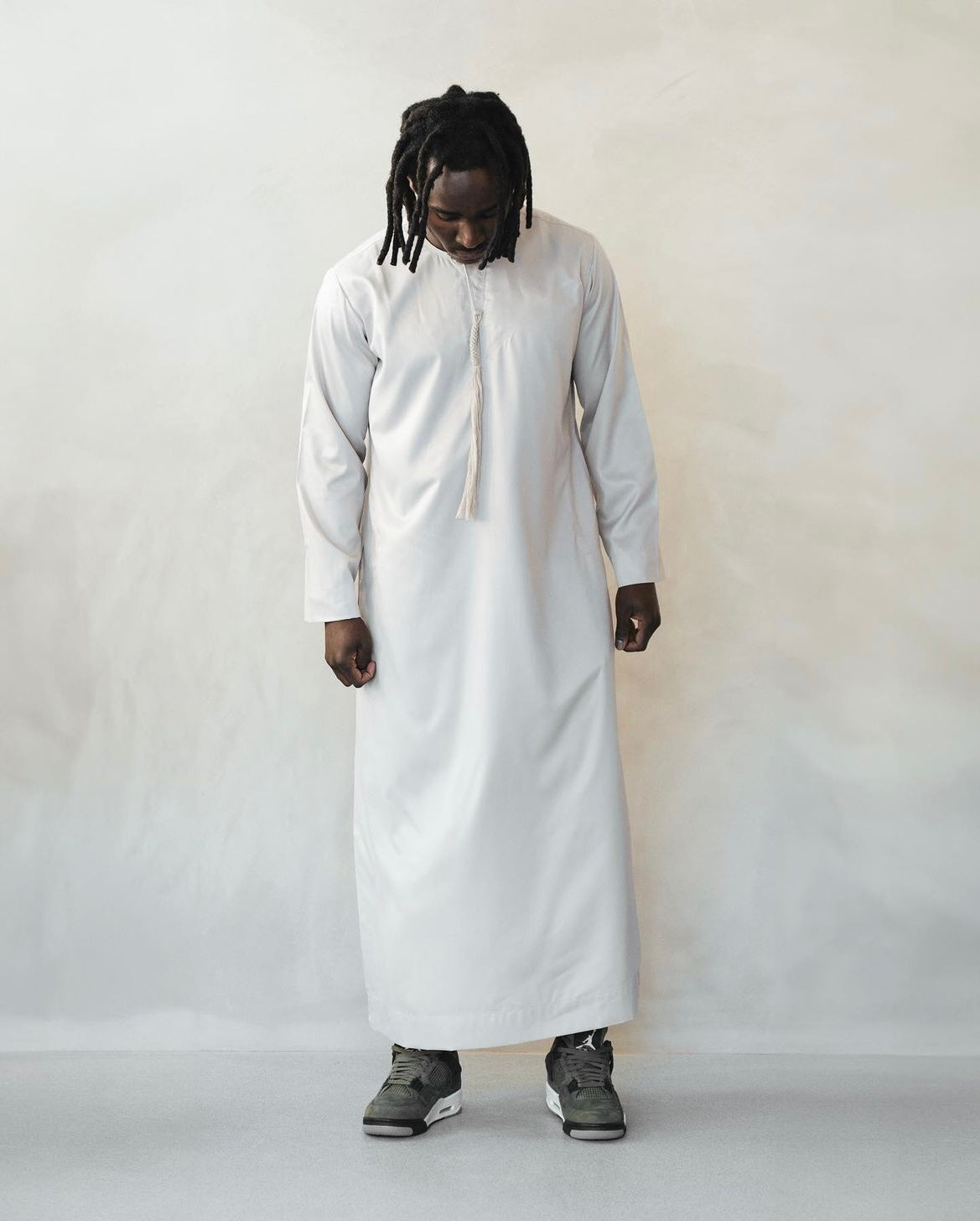 The Emirati thobe reflects the refined simplicity of Gulf tradition—clean lines, quality fabric, effortless elegance. This version is cut from breathable cotton with a tailored silhouette that sits sharp without stiffness.