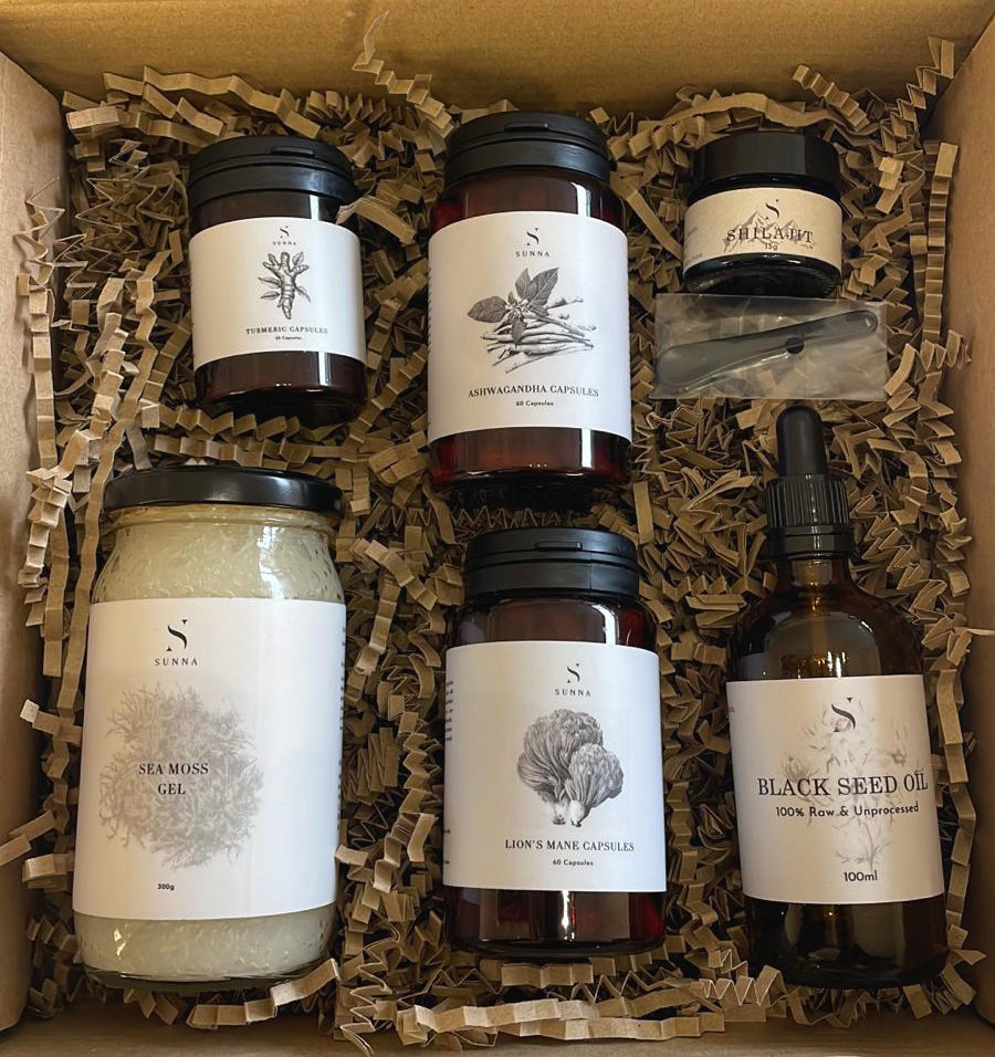 Experience holistic wellness with our expertly crafted selection of natural supplements, designed to support nearly every aspect of your health. Our package includes ashwagandha capsules for stress relief, Lion’s Mane for mental clarity, shilajit resin for vitality, sea moss for nutrient-rich support, and turmeric enhanced with black pepper for joint and immune health. Together, these potent ingredients provide comprehensive care for your mind, body, skin, and hair.