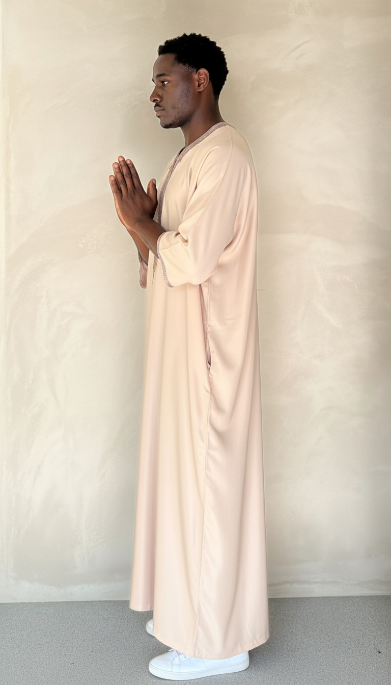 The Moroccan thobe has been the cornerstone of modest dress for generations. This version carries that tradition forward with natural cotton that breathes. The embroidered neckline adds refined detail without excess. Designed to move with you—whether you're heading out or staying in.